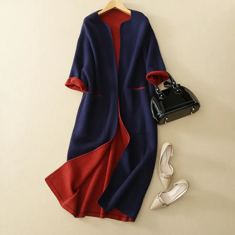 Big Sale double sided color pure mink cashmere knit women fashion long cardigan sweater coat 3quarter sleeve
