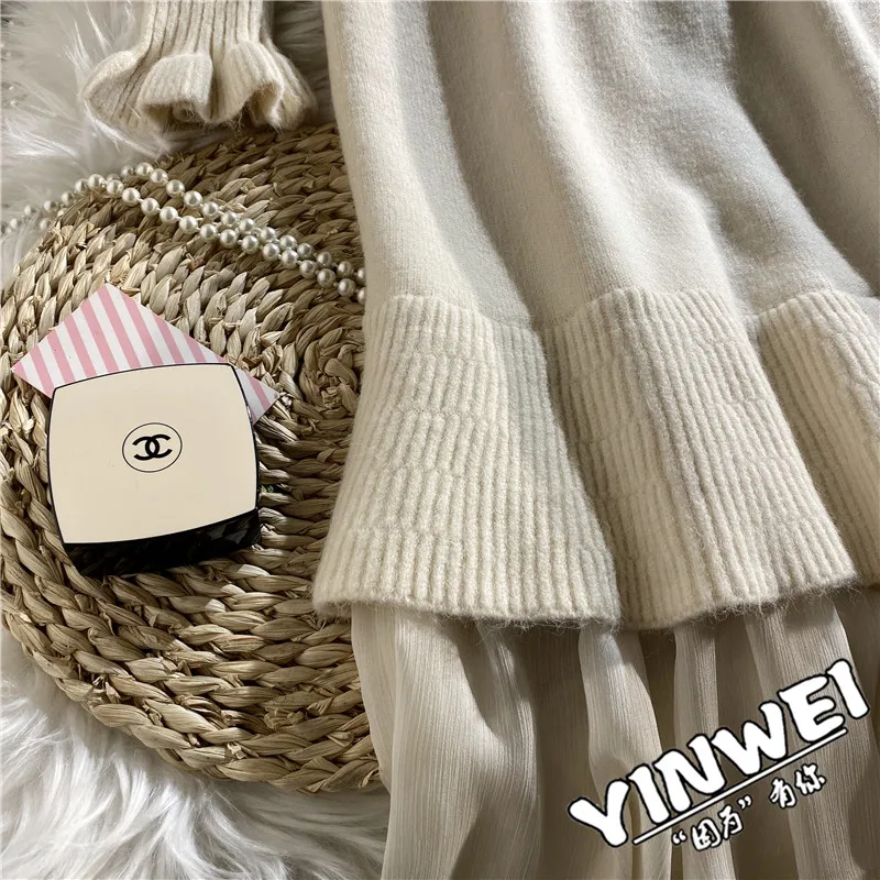 Big Sale Sweater skirt women's knee long section 2019 new autumn and winter lace stitching bottoming knit dr